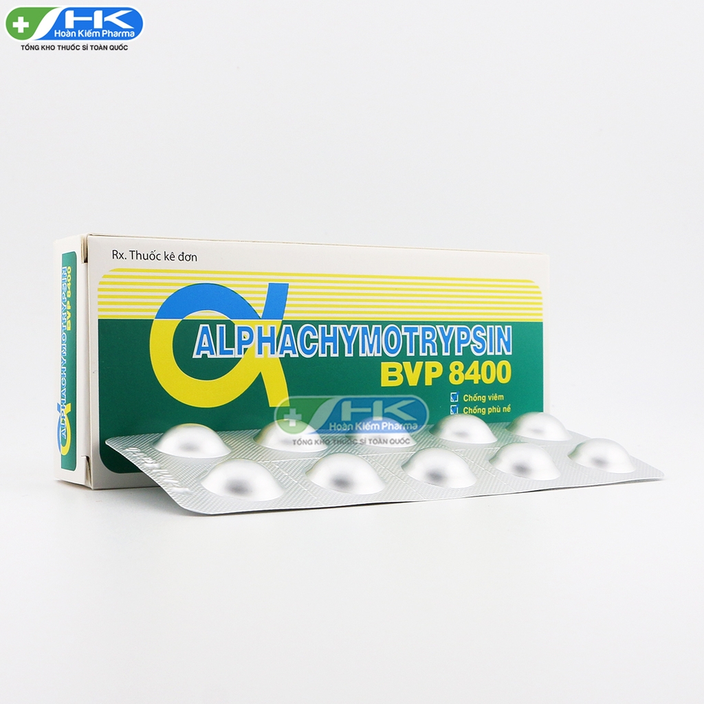 Thuốc Alphachymotrypsin BVP 8400 với thành phần chính là alpha chymotrypsin với hàm lượng 8,4mg. Thuốc được dùng trong các trường hợp phù nề, giảm viêm và làm lỏng dịch tiết đường hô hấp hiệu quả.