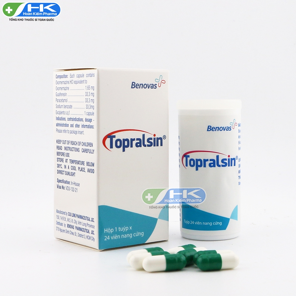 Topralsin - Hộp 1 tuýp x 24 viên nang cứng - MekoPhar(Oxomemazine 1.65mg; Guaifenesin,Paracetamol,Natri benzoat 33.3mg)
